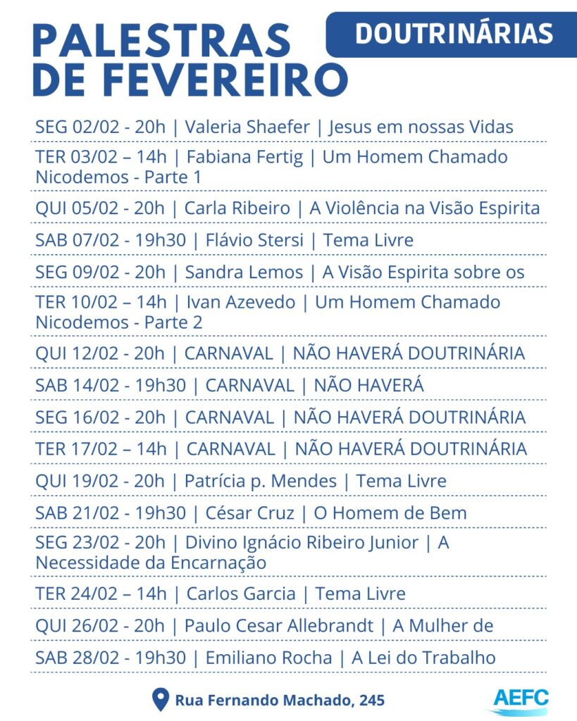 Leia maisA Associação Espírita Fé e Caridade é uma Instituição que abraça os Princípios Doutrinários da Codificação Espírita de Allan Kardec, filiada à Federação Espírita Catarinense. Foi fundada em 1916 e prossegue ofertando aprendizado do Evangelho de Jesus, à luz da Doutrina Espírita por meio de atividades de estudos, evangelização infanto-juvenil, divulgação, acolhimento espiritual e assistência social espírita. Para seus trabalhadores constitui-se na “Casa Espírita de Amor, no templo de Jesus em louvor, na Casa que aquece corações, espaço de amparo e auxílio de irmãos” e caminham compreendendo a AEFC como um Lar na Terra. Venha conhecer nossas atividades, aprender e crescer conosco!